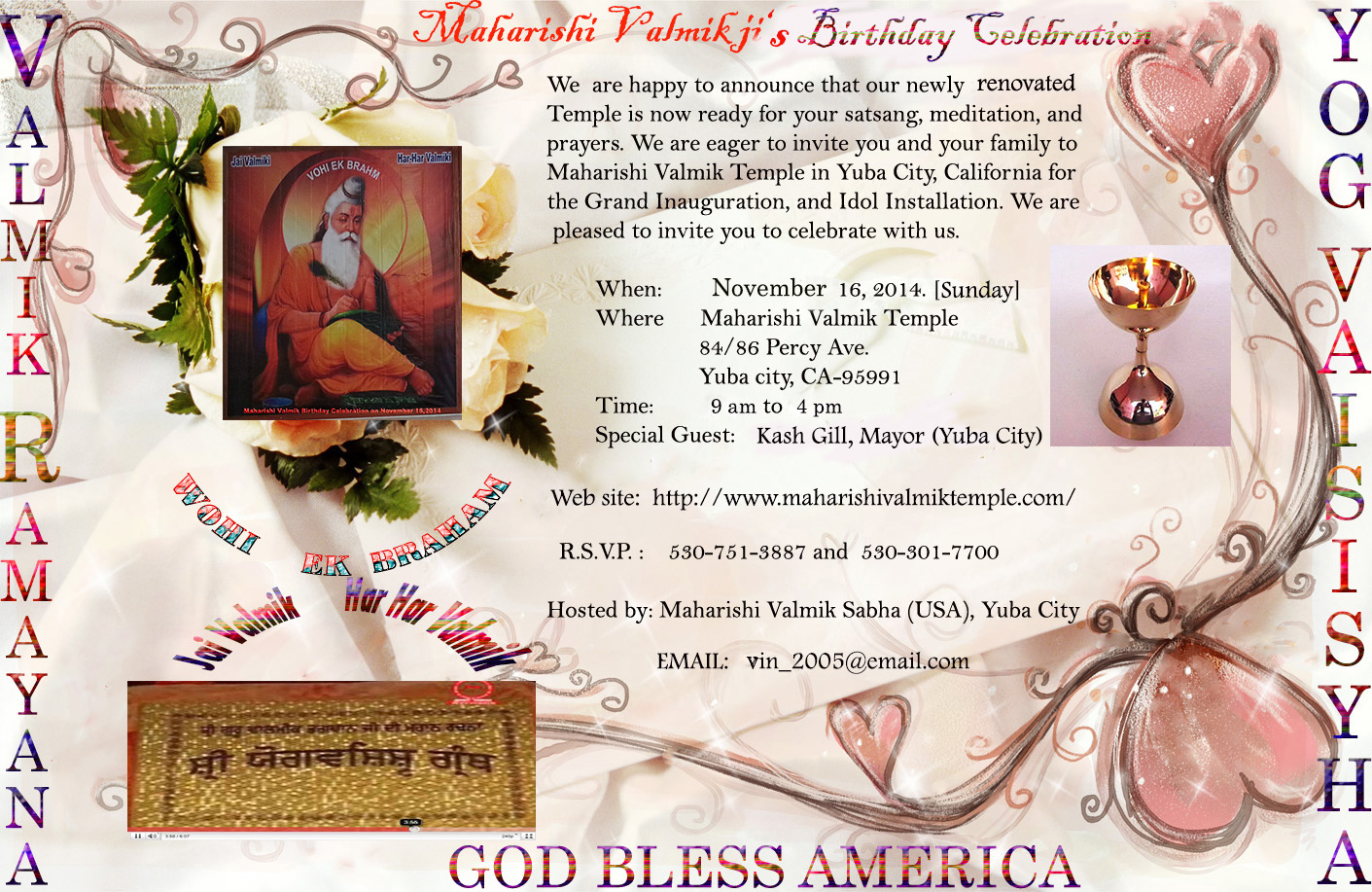 Bhagwan Maharishi Valmik Ji: When Rama visited the hermitage of Valmiki, Maharishi Valmiki said " I am the tenth son of Prechetas ". Now we have first Maharishi Valmik Temple in USA @84/86 Percy ave., Yuba city, California, USA. Services will be in the coming days/months. And last but not least, it is your temple. Please come and visit and get the blessing of Ramayana's writer Maharishi Valmik ji. Pavaan Valmik Tirath.